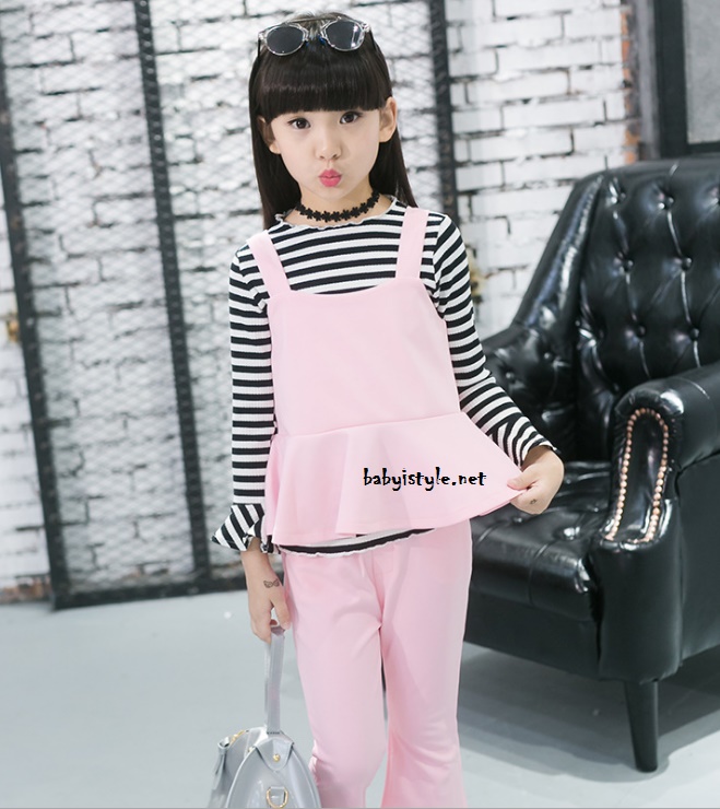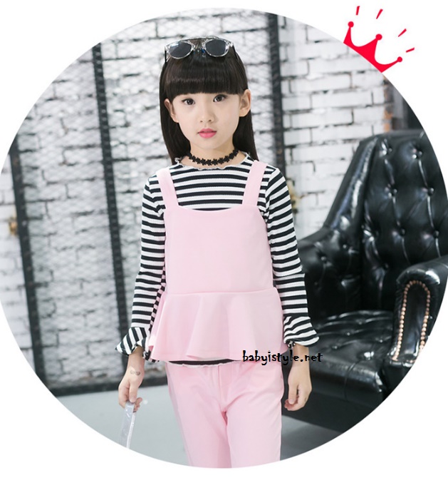 เด็กโต-ชุด3ชิ้นเสื้อริ้วสีขาวดำแขนยาวกระดิ่ง(ผ้ายืดหยุ่นได้)