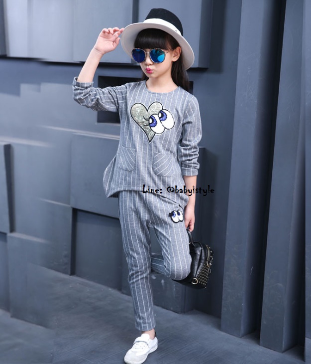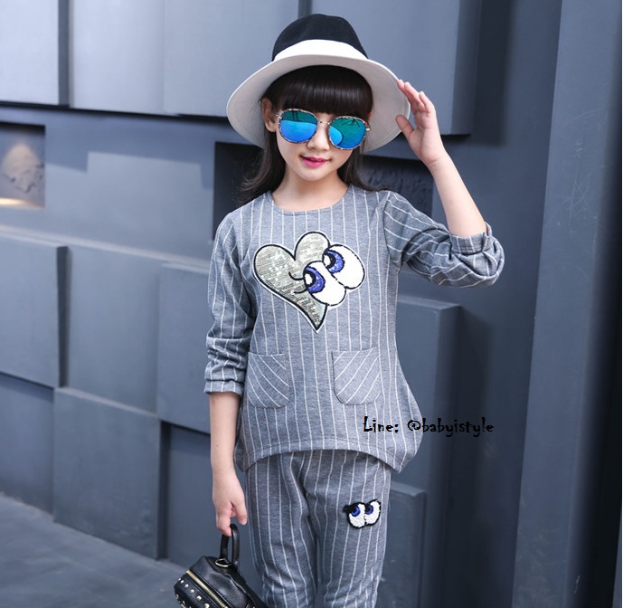 เด็กโต-ชุด2ชิ้นเสื้อแขนยาวสีเทาลายริ้วติดเหลื่อมรูปหัวใจตาปิ๊งๆ