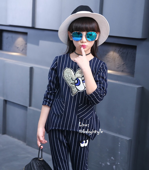 เด็กโต-ชุด2ชิ้นเสื้อแขนยาวสีกรมท่าลายริ้วติดเหลื่อมรูปหัวใจตาปิ๊งๆ