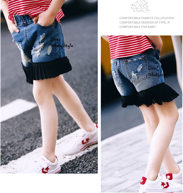 เด็กโต-กางเกงยีนส์ขาสั้นแต่งขาดๆ ชายแต่งผ้าชีฟองสีดำอัดพลีท ขอบเอวยางยืด มีกระเป๋าหลัง งานสวยเปรี้ยว ไซส์ 140/150/160