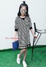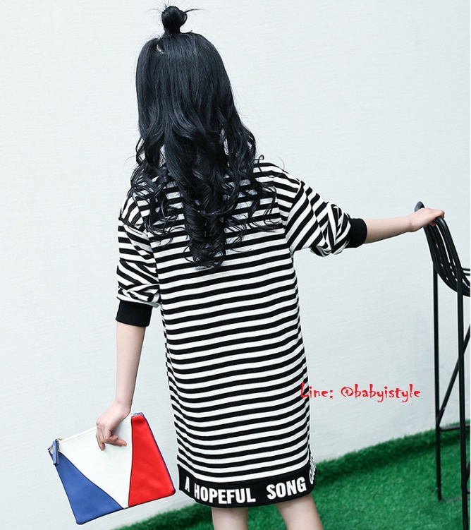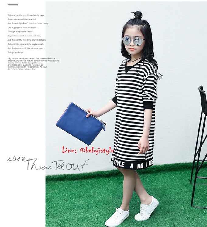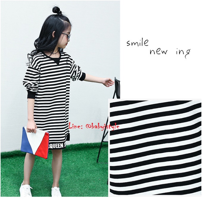 เด็กโต-เดรสแขนยาวจั๊มพ์ลายริ้วสีดำ ชายสกรีน CCQUEEN STYLE ผ่าข้าง ผ้านุ่ม งานสวยเก๋ค่ะ ไซส์ 130/140/150/160