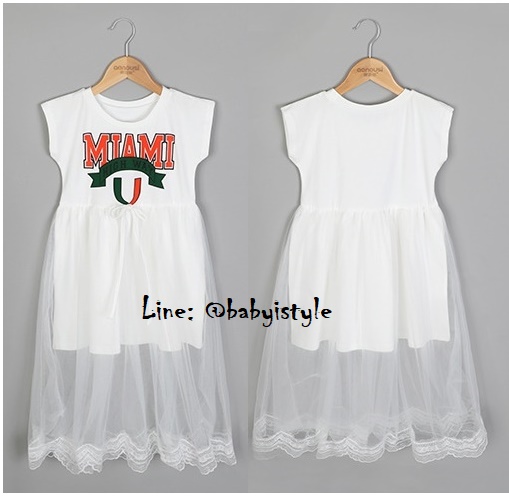 เด็กโต-เดรสยาวพรีเมี่ยมสีขาวแขนล้ำสกรีน MIAMIต่อกระโปรงผ้ามุ้งสีขาวชายลูกไม้ งานสวยเริ่ด ไซส์ 130/140/150
