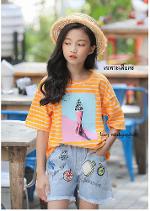 เด็กโต-เสื้อครอปแขนสั้นลายริ้วสีส้มสกรีนICE CREAM ผ้าดียืดหยุ่นได้ (ไม่รวมกางเกง)