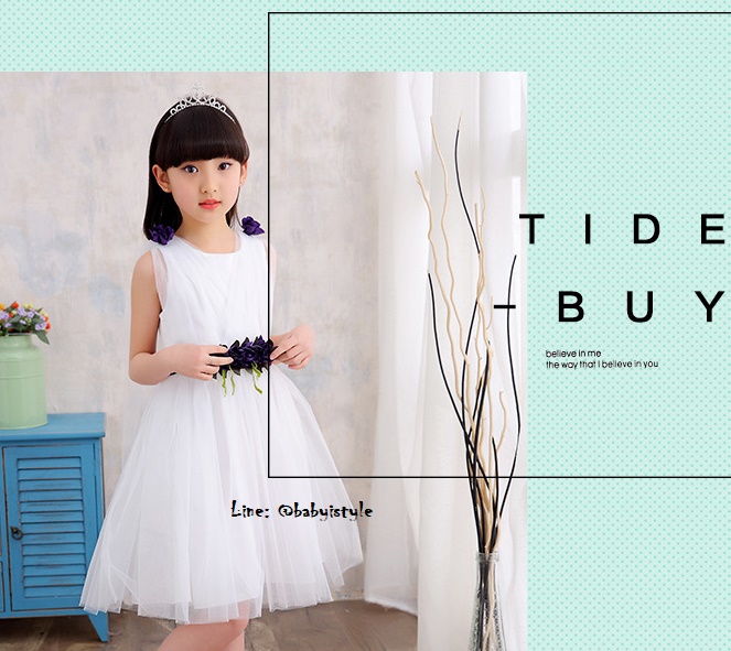 เด็กโต-เดรสออกงานแขนกุดสีขาว เอวแต่งดอกไม้สีม่วงผูกริบบิ้นหลัง ราคา 590 พิเศษ 410 บาท*ไม่รวมค่าส่ง