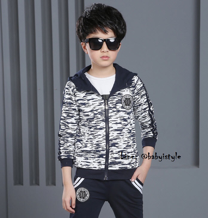 เด็กโต-ชุด2ชิ้นเสื้อแขนยาวจั๊มพ์สีขาวลายพรางสีกรม ซิปหน้า มีกระเป๋าหน้า(ไม่มีเสื้อตัวใน)