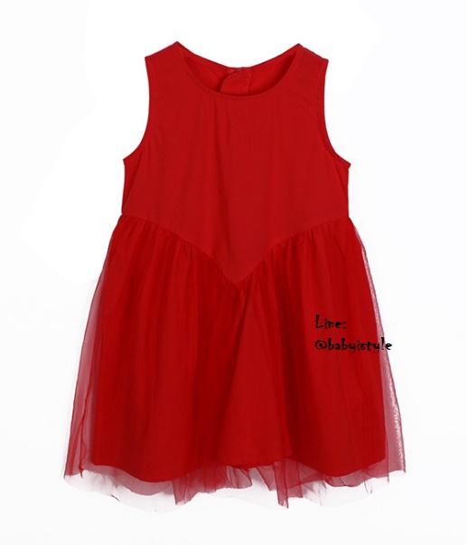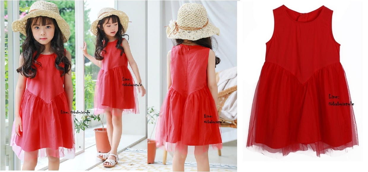 เด็กโต-เดรสพรีเมี่ยมแขนกุดสีแดง ซ้อนผ้าตาข่ายด้านนอกช่วงกระโปรง ผ้าคอตตอน มีซิปหลัง งานสวยน่ารัก