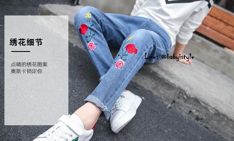 เด็กโต-กางเกงยีนส์ขายาวพับเบิ้ลชายปล่อย ปักดอกไม้ เอวยางยืด มีกระเป๋าหลัง งานสวยเก๋