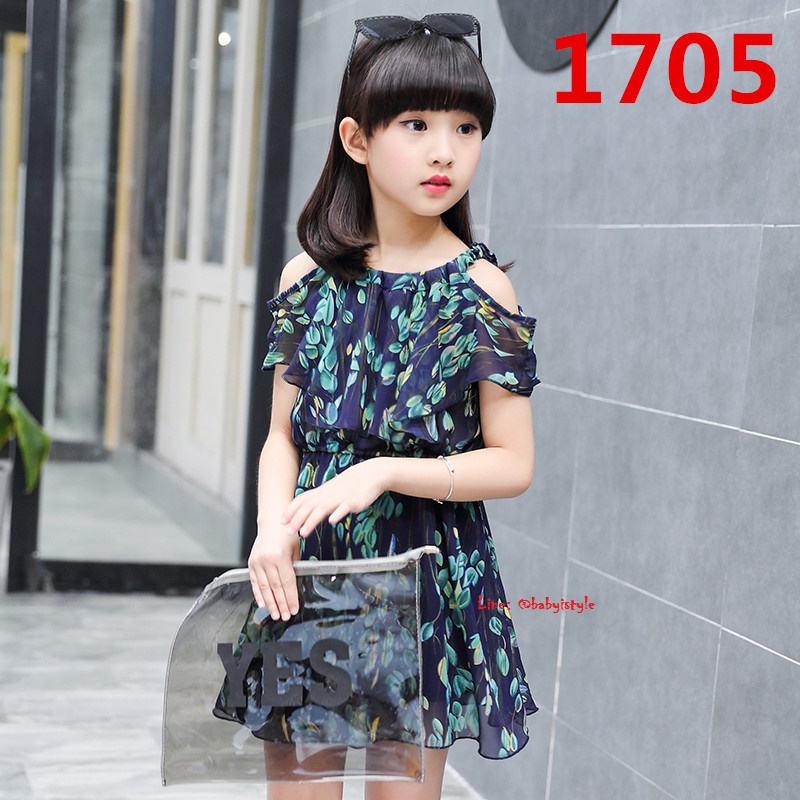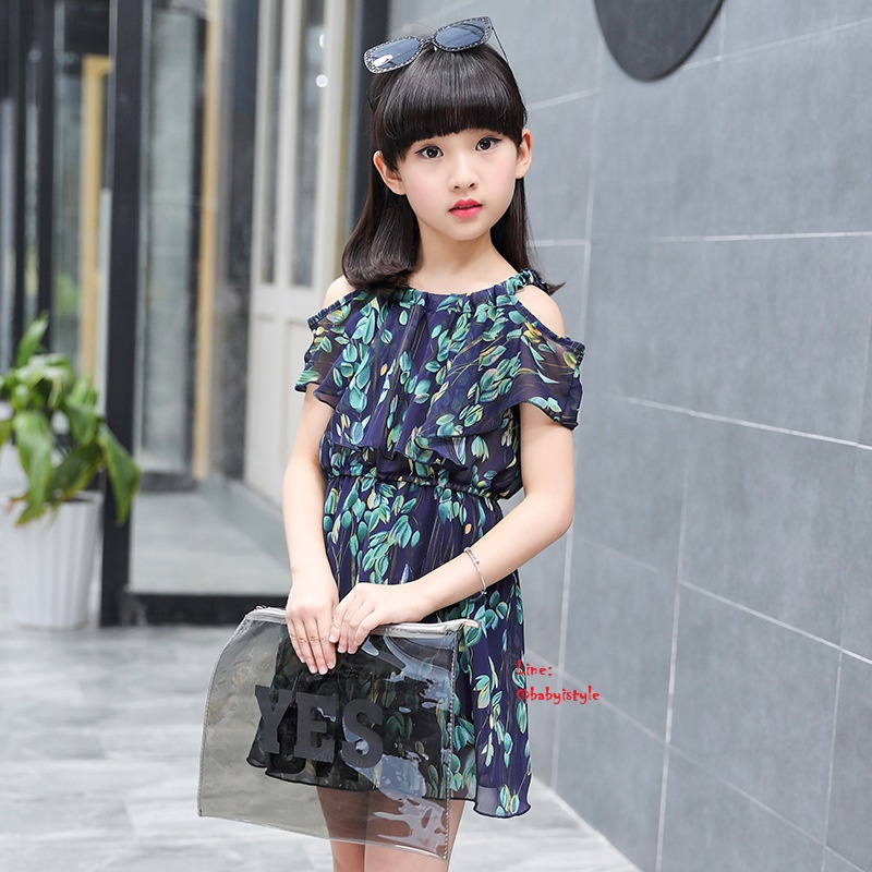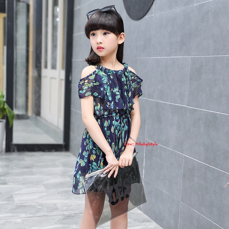 เด็กโต-เดรสเปิดไหล่สีกรมท่า ลายใบไม้ ช่วงเอวยางยืด มีซับในตั้งแต่ช่วงเอวลงมา ผ้าพริ้วสวยน่ารักมากๆ