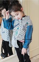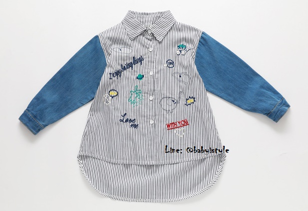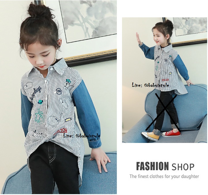 เด็กโต-เสื้อเชิ้ตสีขาวริ้วเทาดำต่อแขนยาวผ้ายีนส์ ปักลวดลายสวยงาม หน้าสั้นหลังยาว งานสวยเก๋ค่ะ ราคาปกติ 399 พิเศษ 299 บาท*ไม่รวมค่าส่ง