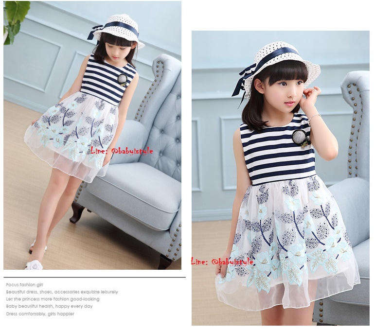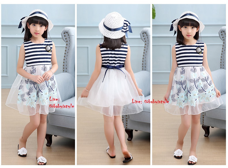 เด็กโต-ชุด 3 ชิ้นเดรสแขนกุดลายริ้วสีกรม-ขาวต่อกระโปรงผ้าแก้วปักดอกไม้โทนสีฟ้า+หมวกสีขาว+ติดเข็มกลัด
