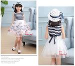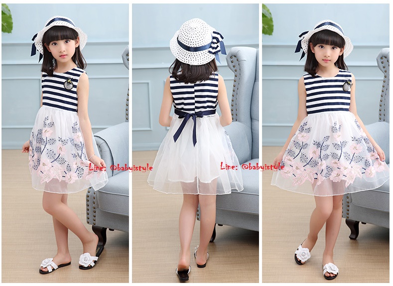 เด็กโต-ชุด 3 ชิ้นเดรสแขนกุดลายริ้วสีกรม-ขาวต่อกระโปรงผ้าแก้วปักดอกไม้โทนสีชมพู+หมวกสีขาว+ติดเข็มกลัด