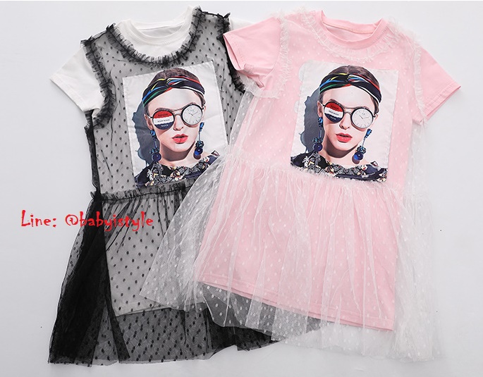 เด็กโต-ชุด2ชิ้นเดรสแขนสั้นสีขาวCOURAGE+เดรสผ้าตาข่ายสีดำปักรูปสาวเปรี้ยว งานสวยน่ารักชิคๆ