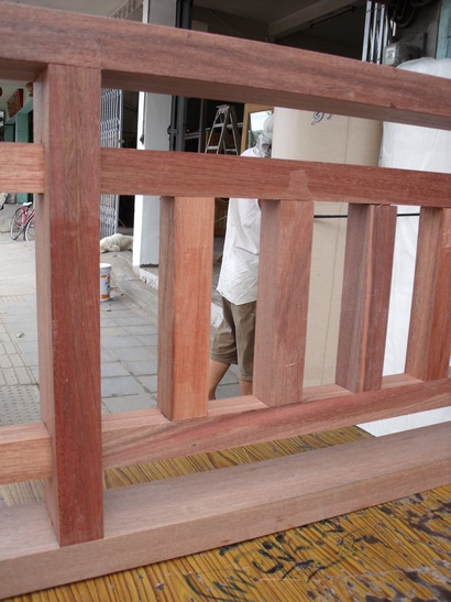 บังตาภายนอกไม้เต็งแดง ด้านนอกใช้ไม้ 2x4นิ้วส่วนภายในใช้ไม้ 2x2นิ้ว ผลิตโดยวิธีเดียวกับวงกบ ซึ่งใช้วิธีเซาะร่องเดือยจิ๊กซอเพื่อเพิ่มความแข็งแรง