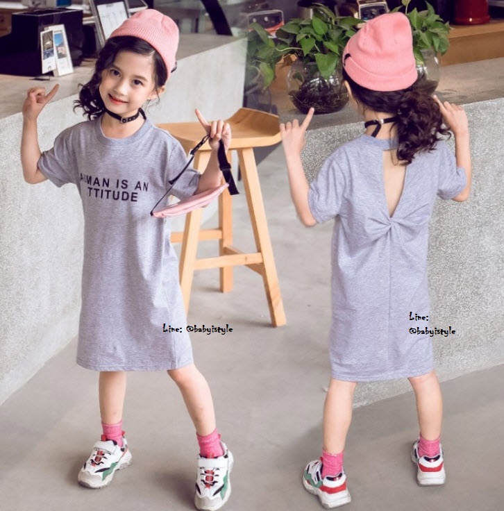 เด็กโต-เดรสแขนสั้นสีเทาสกรีน AUMAN IS AN ATTITUDE หลังเว้าหยดน้ำบิดเกรียว สวยเก๋ ไซส์ 140/150/160