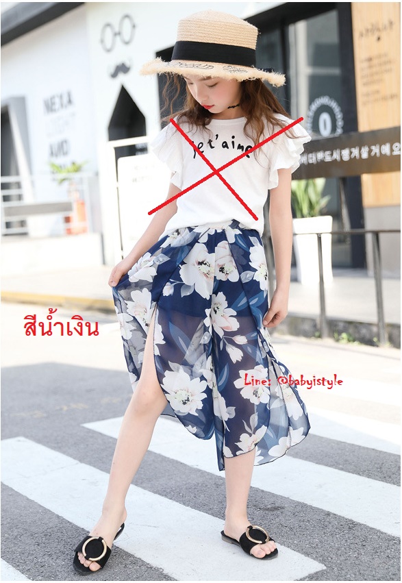เด็กโต-กางเกงขายาวผ่าข้างสีน้ำเงินลายFlower มีซับในสั้น เอวยางยืด ผ้าพริ้วชีฟอง งานสวยน่ารัก ไซส์ 140/150/160