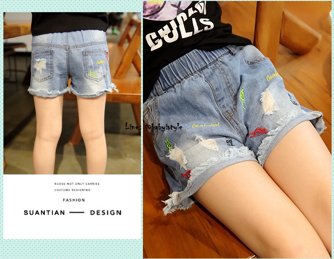 Sales เด็กโต-กางเกงยีนส์ขาสั้นชายปล่อยพับ ปักลายเส้นหัวใจ ขอบเอวยางยืด มีไซส์ 140 รหัส KKK689