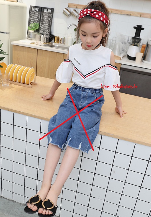 เด็กโต-กางเกงยีนส์ขาสั้นแต่งขาดๆ ชายแต่งผ้าชีฟองสีดำอัดพลีท ขอบเอวยางยืด มีกระเป๋าหลัง งานสวยเปรี้ยว ไซส์ 140/150/160